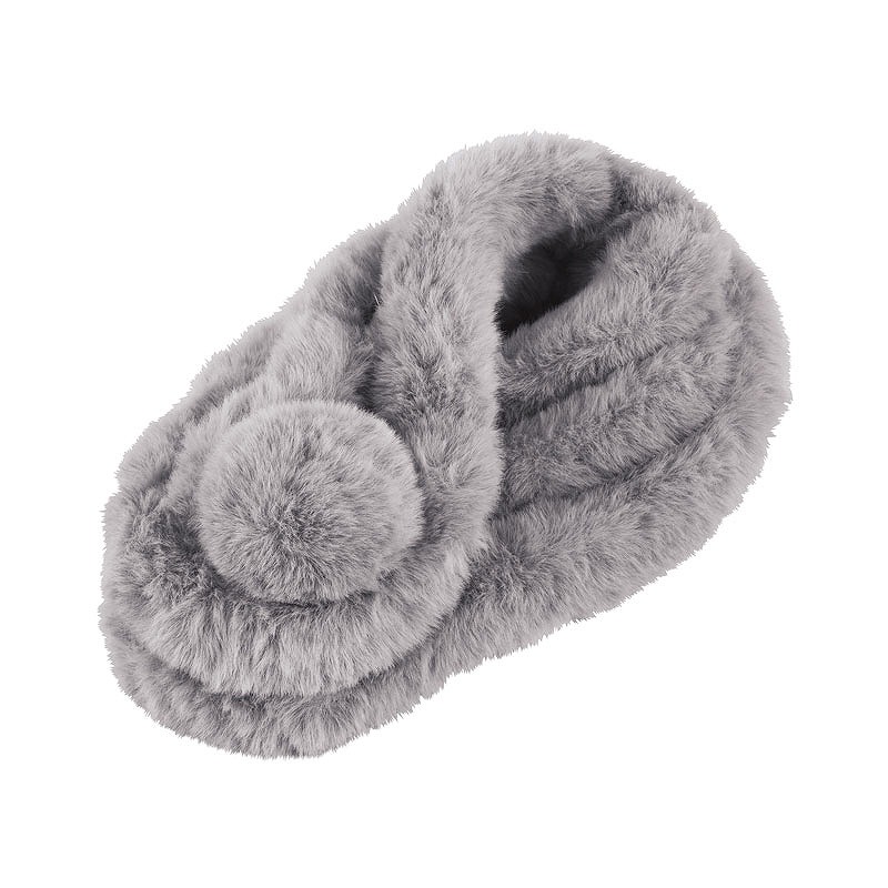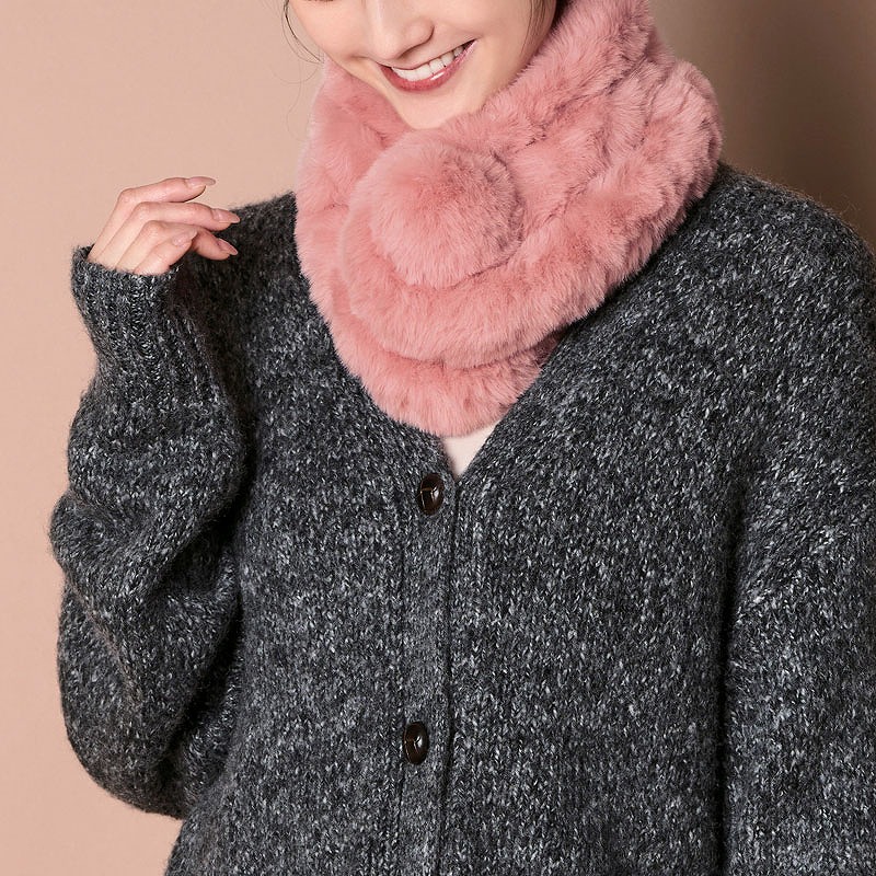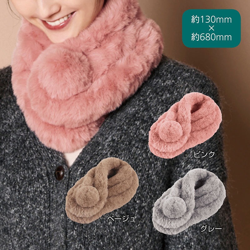 癒されるふわふわ感と丸いファーモチーフがポイント。好みの長さに調節できる着用も簡単な優秀マフラー。