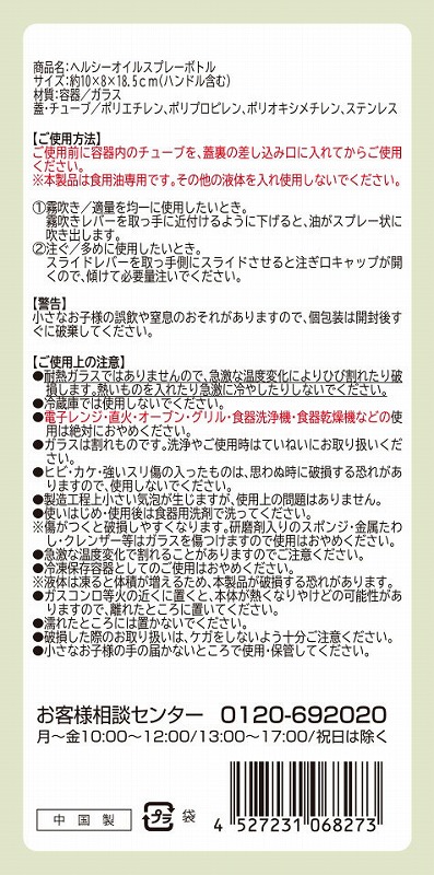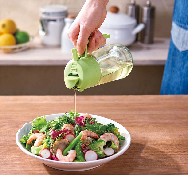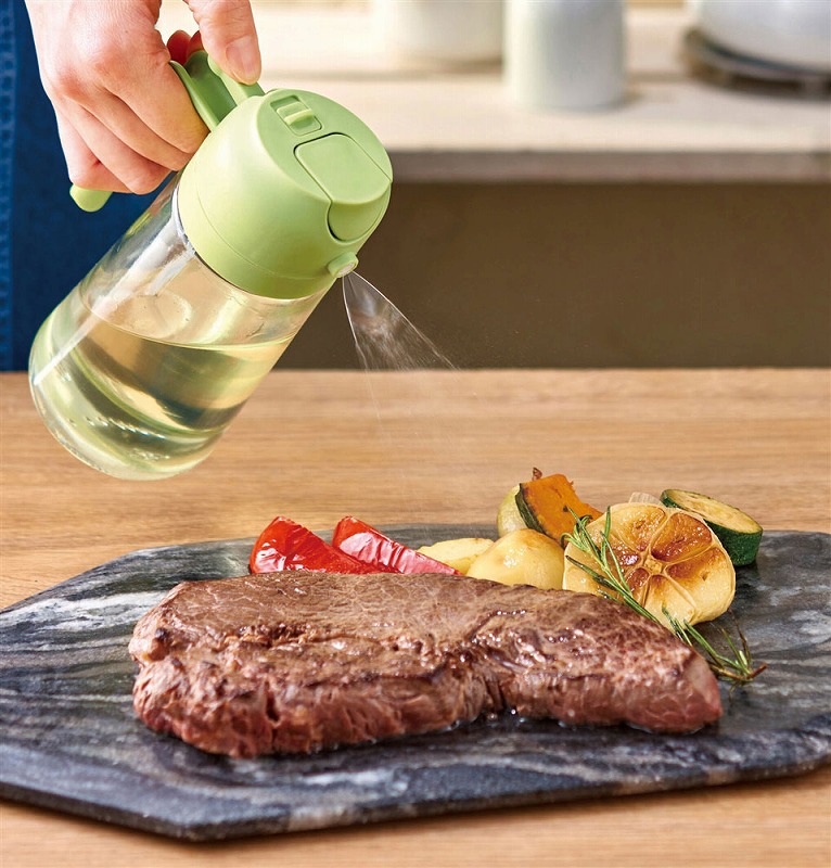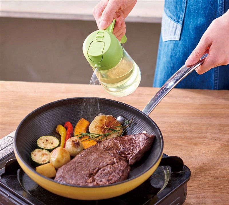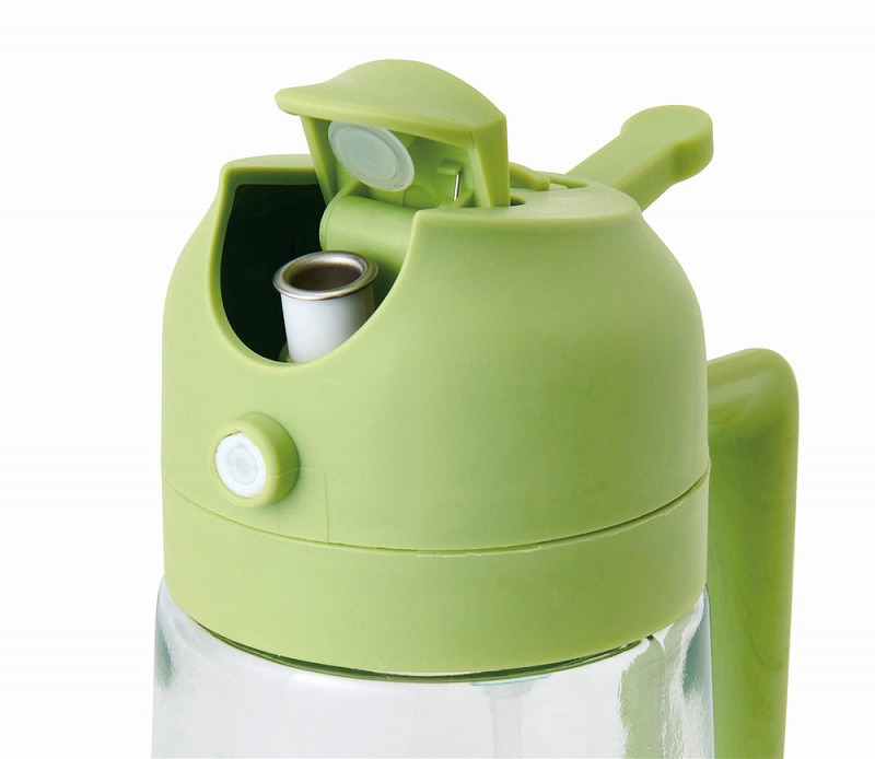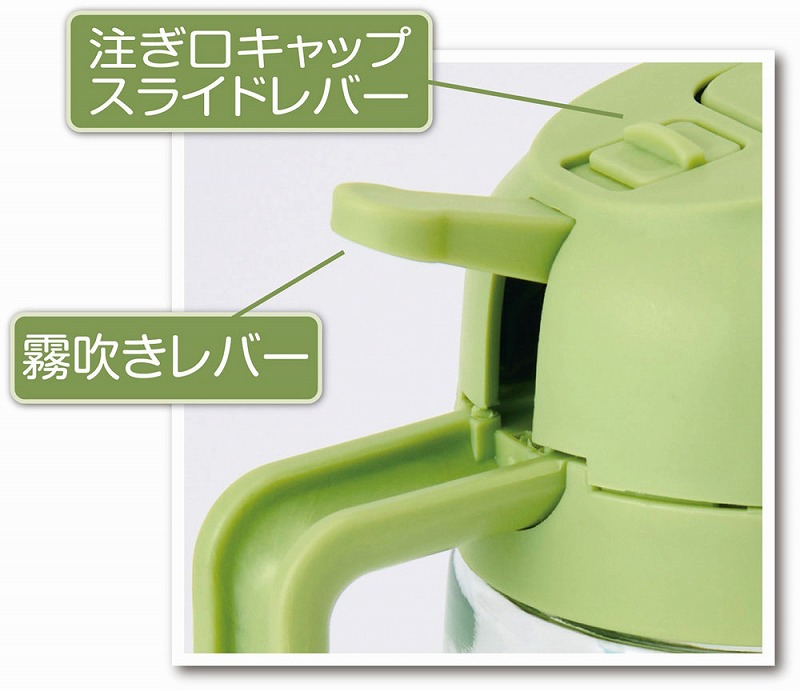 うっかり「ドバッ」とかけすぎることがなくなります! レバーを引くとスプレー、フタを開けるとオイルを注げます。注ぎ口はオイルが垂れにくい設計に、本体は中身の補充や詰め替えが簡単な広口設計になっています。
