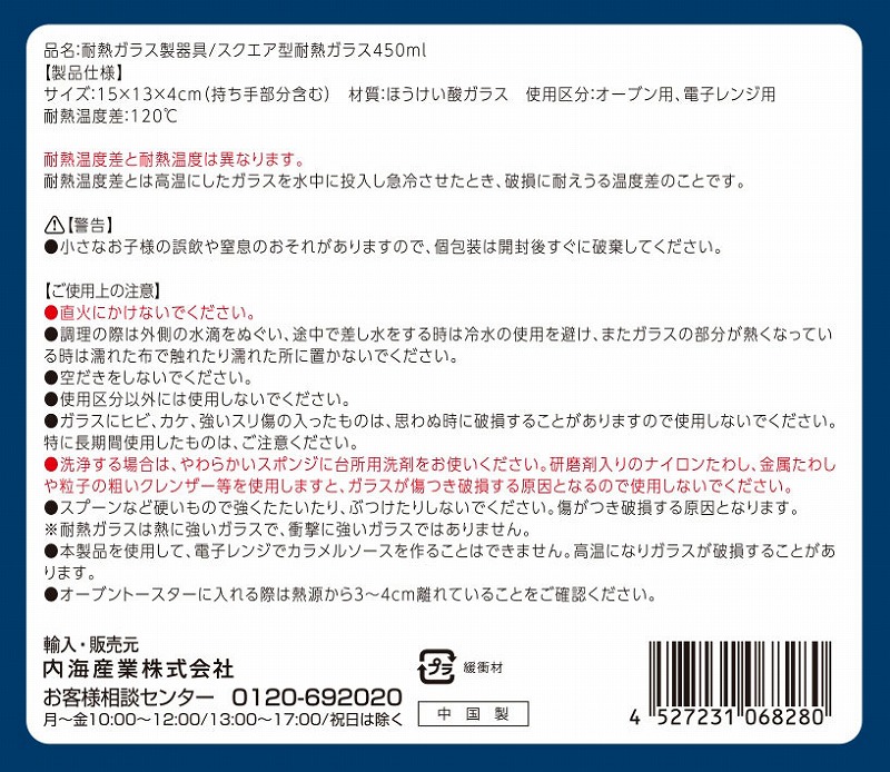 ”販促ノベルティ・記念品・イベントに!” 『スクエア型耐熱ガラス450ml』