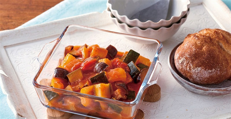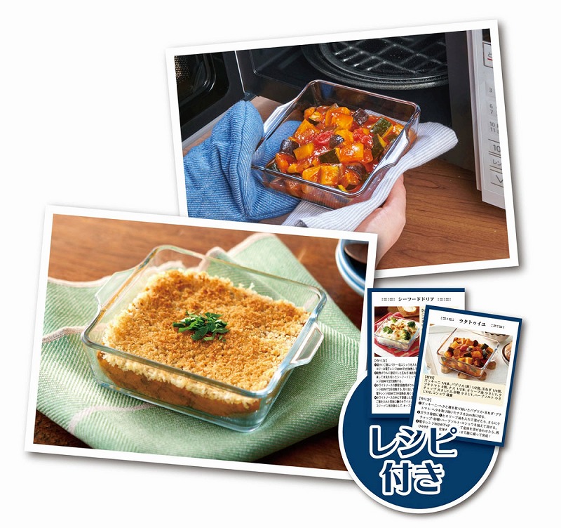 電子レンジ/オーブン/トースターで使用OK!(直火不可) 「スプーンで食べるかぼちゃカレーコロッケ」「ラタトゥイユ」「シーフードドリア」の3種のレシピ付きです。