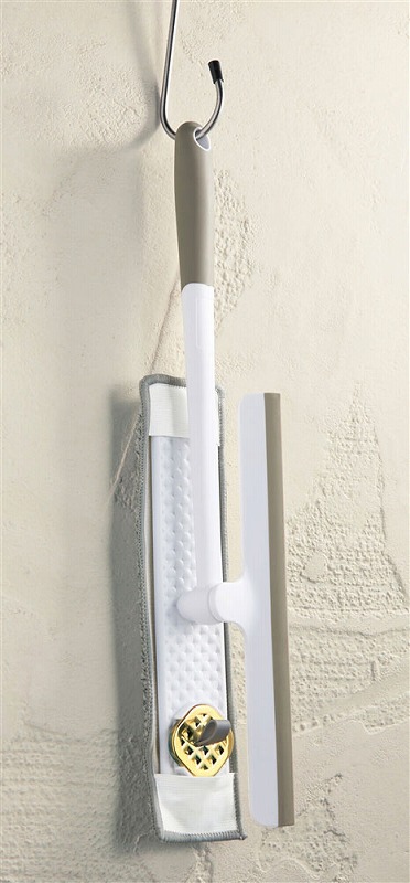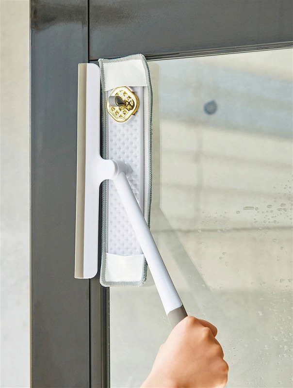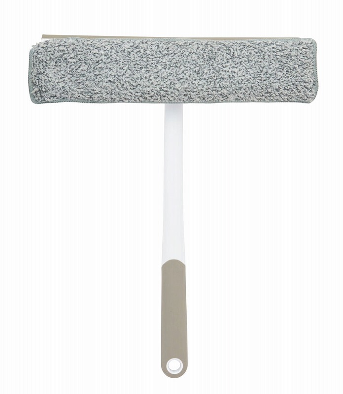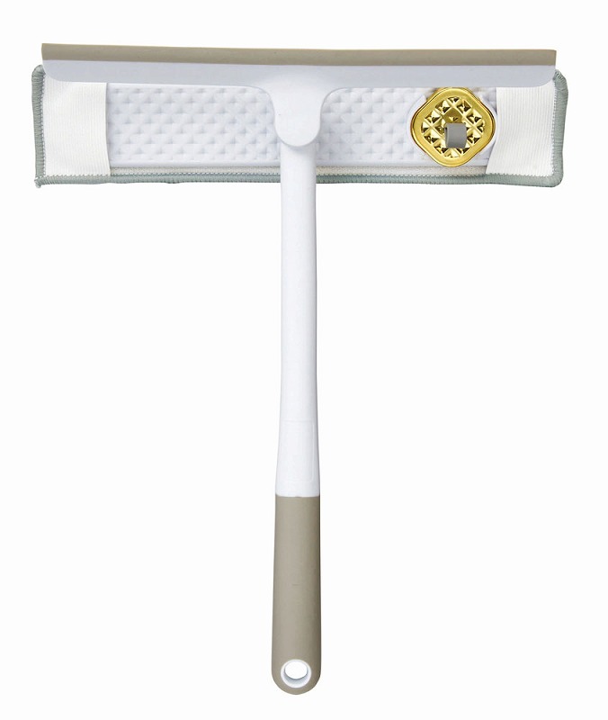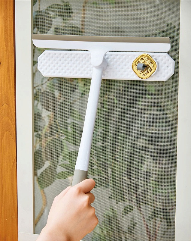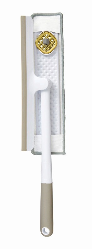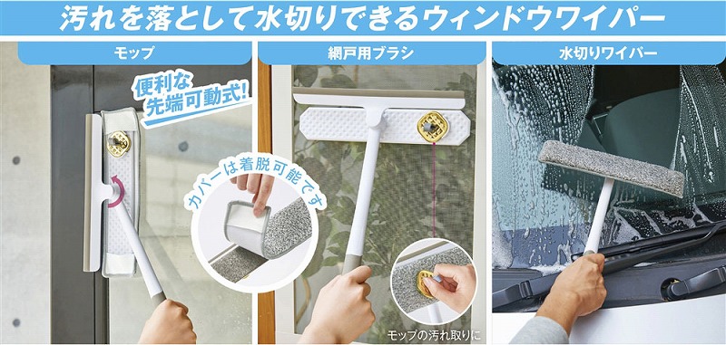 モップ・網戸用ブラシ・水切りワイパーの3つの機能を1本で実現。モップカバーは着脱可能で、モップの汚れ取り用ツールも付属しています。小回りが利くハンディサイズで、先端が可動式でT字からI字に変えてコンパクトに収納可能です。