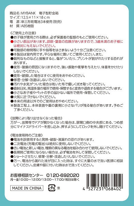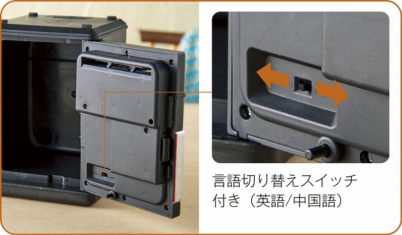 紙幣を挿入すると音楽が流れて中に吸い込まれていきます!硬貨も貯金OK!取り出す時は暗証番号を入力する必要があります。入力した暗証番号が正しい時/間違えている時、それぞれ音声でお知らせします(言語は英語/中国語に切り替えられます)。 現金に触れる機会の少ない現代の子どもたちに、お金の大切さを学ぶ機会をご提供します!