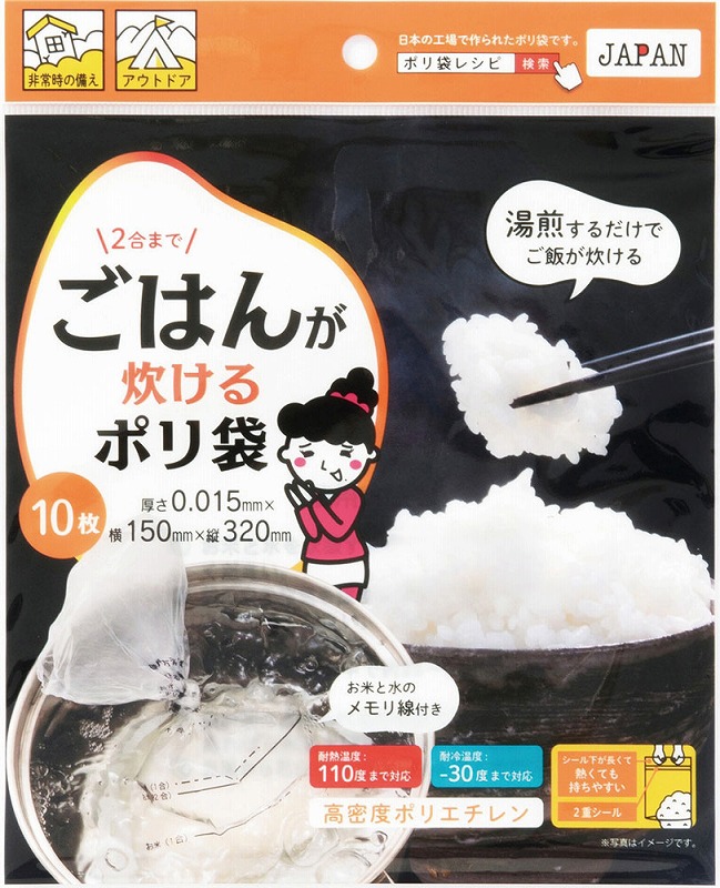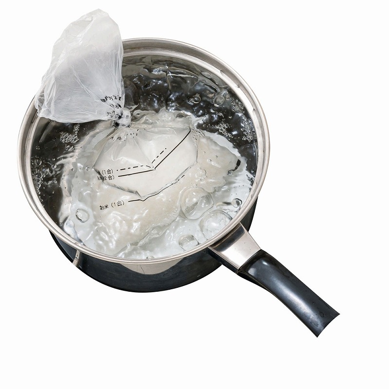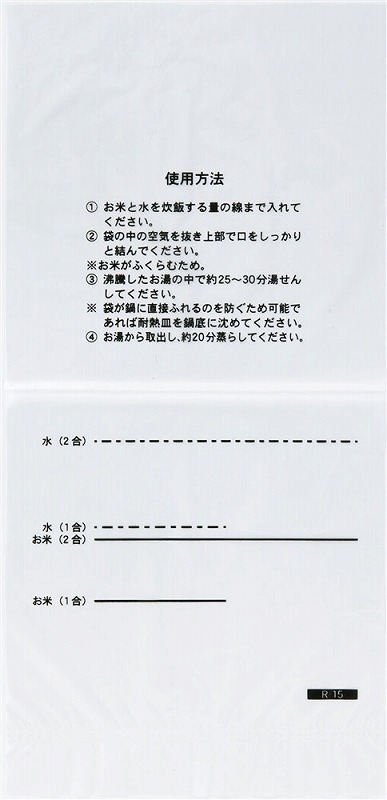 袋本体にお米と水の量の目安線が印刷されています。高密度ポリエチレン製。 ●耐熱温度:110度●耐冷温度:-30度