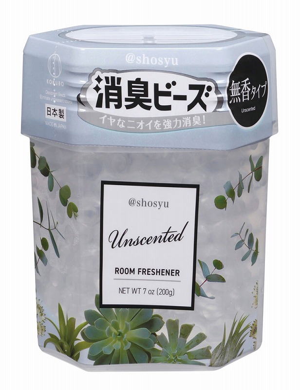 植物性抽出剤、吸水性樹脂を成分とする、透明で丸い粒状の消臭ビーズです。香りタイプは、無香、炭、アクアソープ、ラベンダー、フレッシュレモン、キンモクセイの6種類。ゆっくりと揮発し、無香またはほのかな香りとともに室内を強力消臭します。効果は2~3カ月。(使用環境により異なります)。