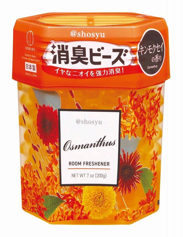 植物性抽出剤、吸水性樹脂を成分とする、透明で丸い粒状の消臭ビーズです。香りタイプは、無香、炭、アクアソープ、ラベンダー、フレッシュレモン、キンモクセイの6種類。ゆっくりと揮発し、無香またはほのかな香りとともに室内を強力消臭します。効果は2~3カ月。(使用環境により異なります)。