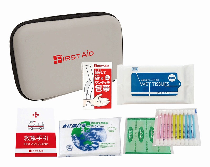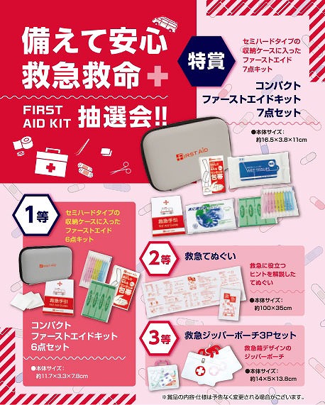 [キット内容] [特賞]コンパクトファーストエイドキット7点セット・・・2本 [1等]コンパクトファーストエイドキット6点セット・・・3本 [2等]救急てぬぐい・・・5本 [3等]救急ジッパーポーチ3Pセット・・・20本 [付属品] 抽選くじ×30、抽選箱×1、くじ明細書×1、告知用A3ポスター×1 ※賞品の内容・仕様は画像と異なる場合があります。あらかじめご了承ください。