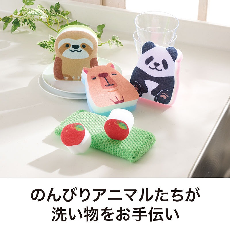 セット内容は、アニマルデザインのキッチンスポンジに加え、水だけで洗えるアクリルスポンジ1個と、リンゴのメラミンスポンジ2個を組み合わせた実用性の高いアソート。