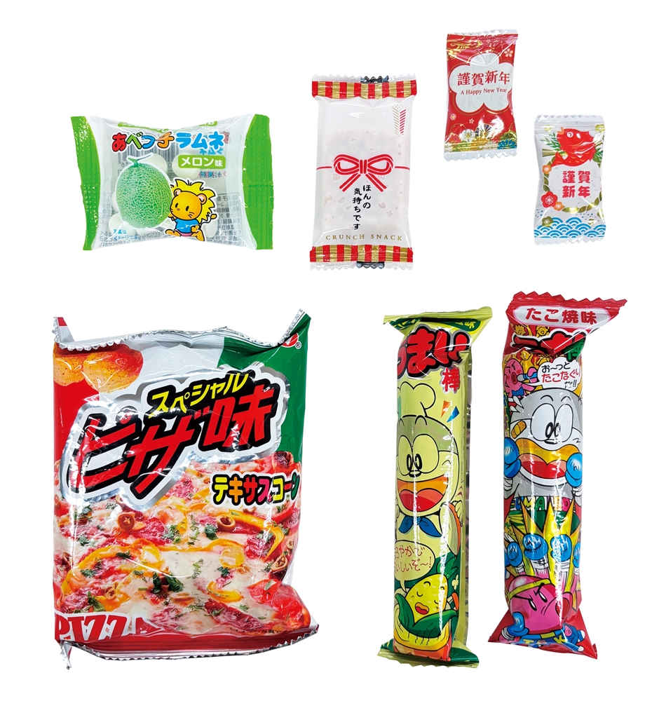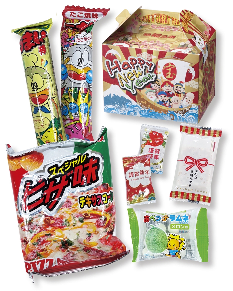 <セット内容> テキサスコーン(スペシャルピザ味)×1 うまい棒×2 あべっ子ラムネ×1 お年賀キャンディ×2 ありがとうクランチ×1