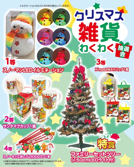 <キット内容> [特賞]ファミリーセットツリー150cmLEDライト付・・・1本 [1等]スノーマンLEDイルミネーション・・・2本 [2等]サンタマグカップ・・・3本 [3等]Xmas2WAYバッグ・・・4本 [4等]スノーキッズ 消しゴム付えんぴつ・・・40本 <付属品> 抽選くじ×50、抽選箱×1、くじ明細書×1、告知用A4カード×1 ※賞品の内容・仕様は画像と異なる場合があります。あらかじめご了承ください。
