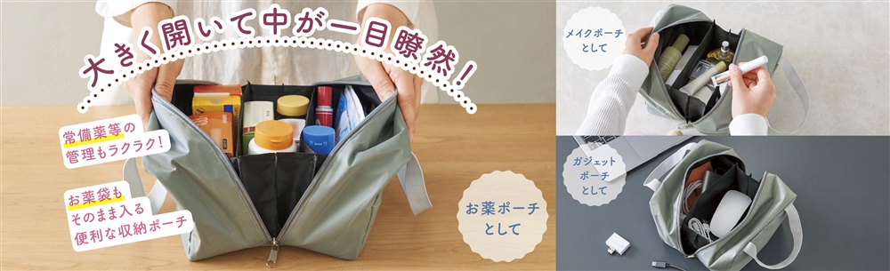 ファスナーを開けるとコの字型に大きく開き、中身が見やすく、出し入れも簡単です。内側には仕切りがあり、サプリメントや薬袋、瓶、ジッパー袋などもそのまま収納できます。メイクポーチやガジェットポーチとしても十分な収納力を持っています。名入れが可能で、お店のオープン記念品などにおすすめです。