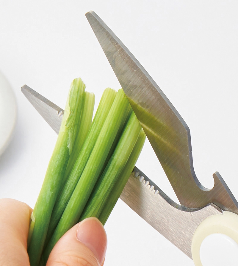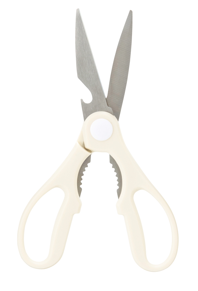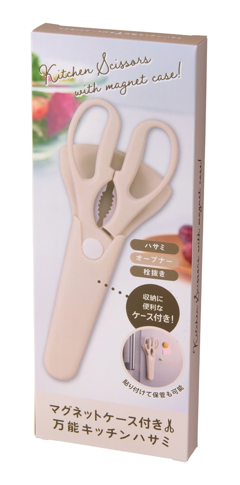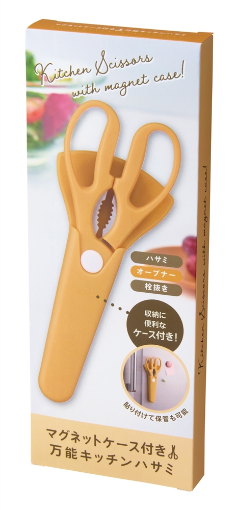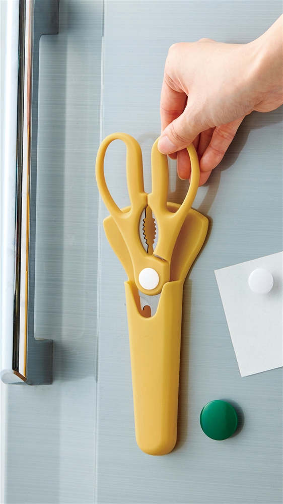 キッチン作業がはかどる万能はさみ。冷蔵庫にピタッとくっつけておけるマグネット付きのケースとセットです。