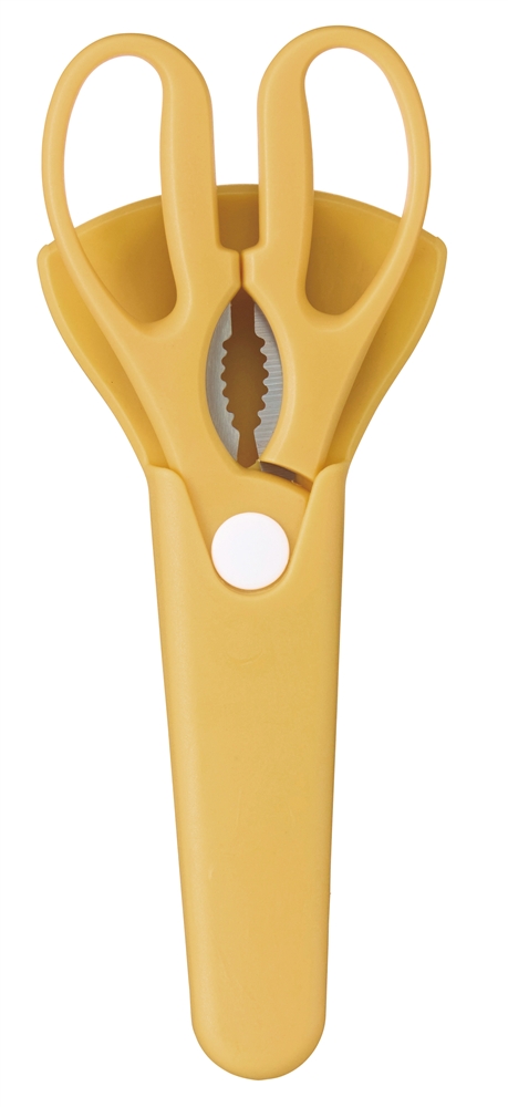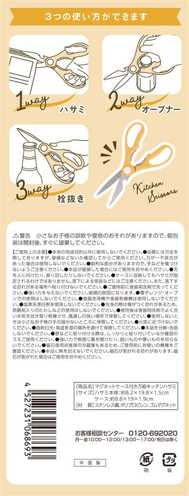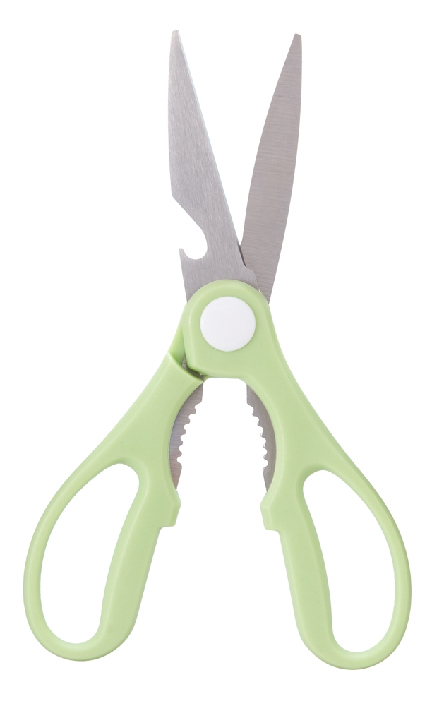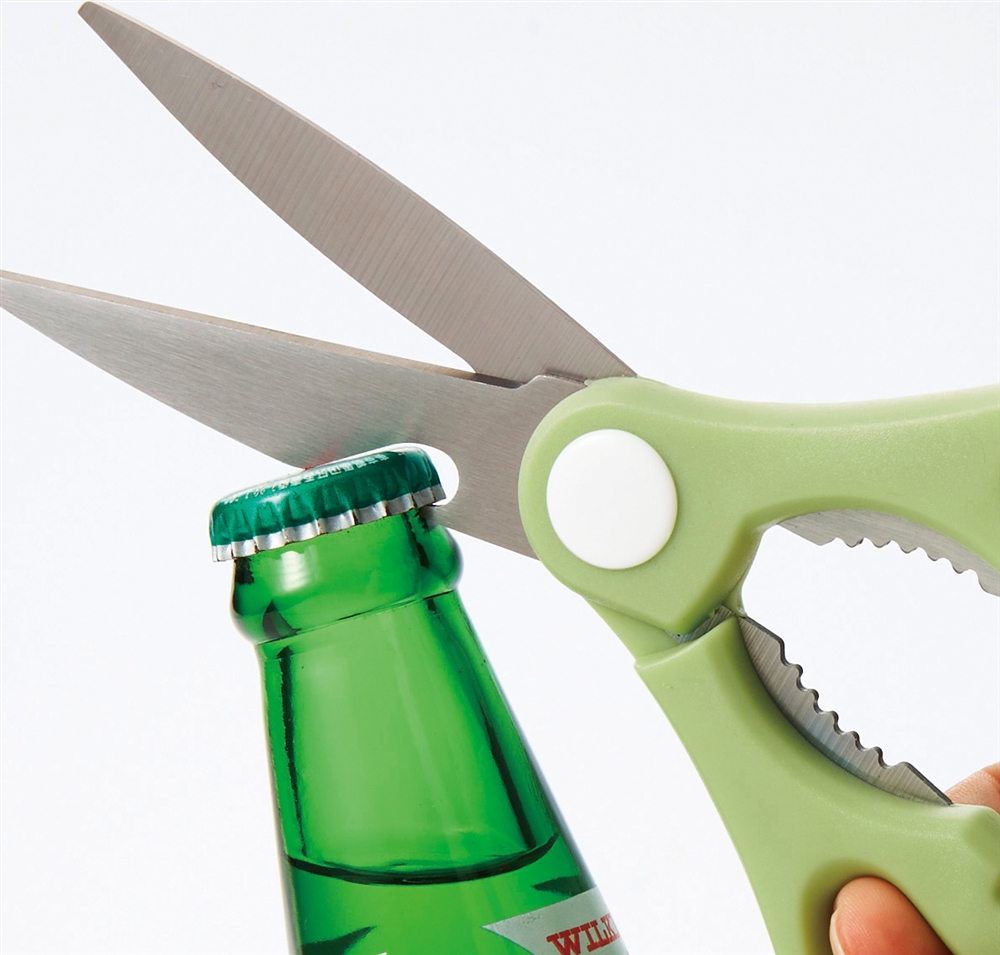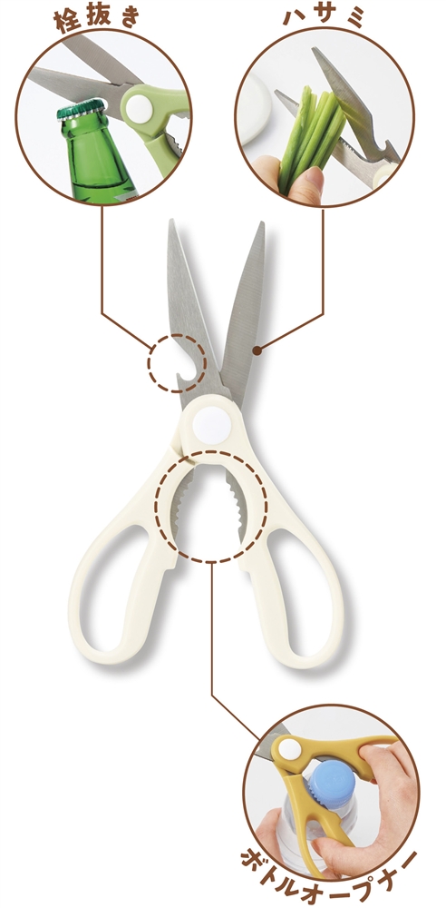 さわやかなグリーン/イエロー/ホワイトの本体カラーと、それぞれに合わせた色の化粧箱でご用意しています。通常のハサミの他、栓抜き、ペットボトルオープナーの機能付き。
