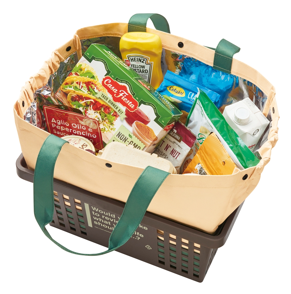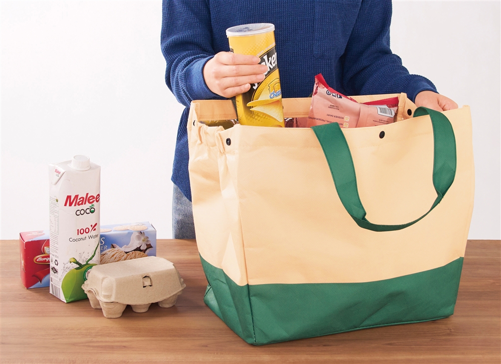 再生PET樹脂製不織布を使用した肩掛けできるレジカゴタイプの保冷温バッグ
