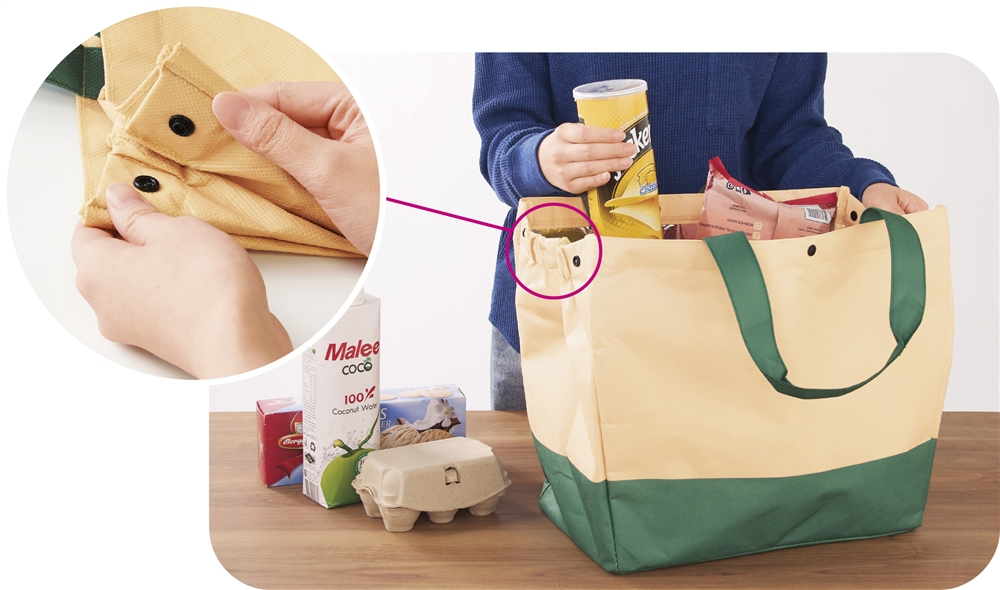 食材の買い出しからアウトドアでも使えるトートーバッグ。バッグ内側はアルミ蒸着加工が施されており、マチがしっかりとありレジカゴにセットしやすく、お買い物に最適です。マチのボタンを外せば容量もたっぷり!間口もボタンで留められ、持ち手は肩掛けでき、持ち運びに便利です。