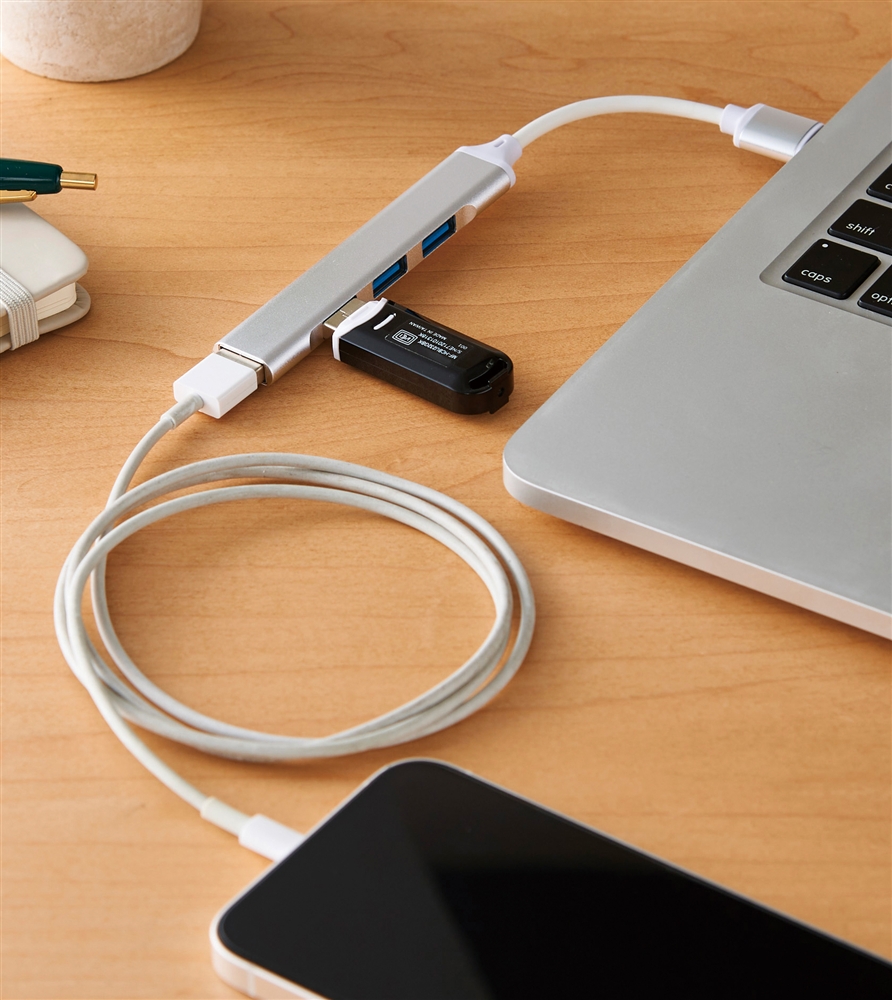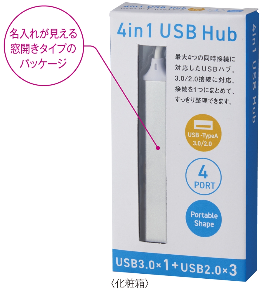 最大4つの接続が可能なUSBハブ。名入れが見える窓あき化粧箱入りです。