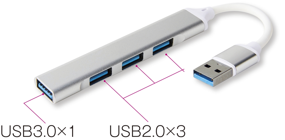 ポート不足を解消するUSBハブで、USB3.0×1とUSB2.0×3の計4ポートを同時に接続ができ、USB3.0対応で高速データ転送が可能です。シンプルでスマートなデザインで、レーザー加工対応しています。化粧箱は名入れが見える窓あき仕様で、展示会や購入特典などの記念品に最適です。