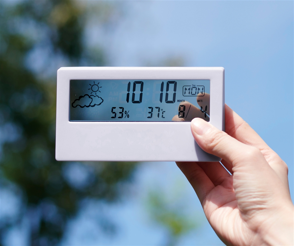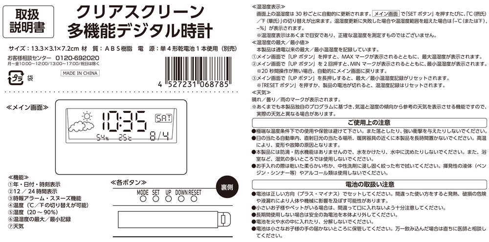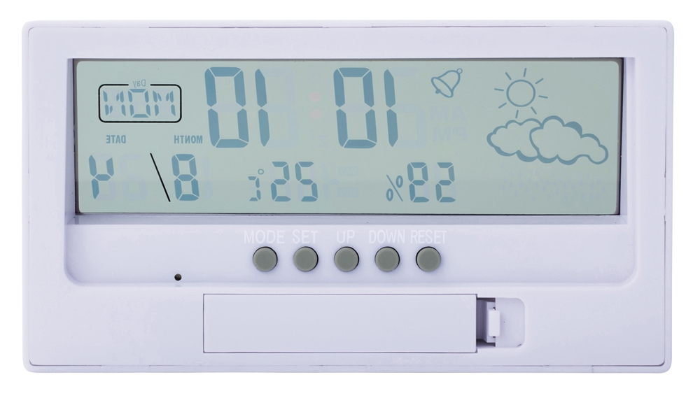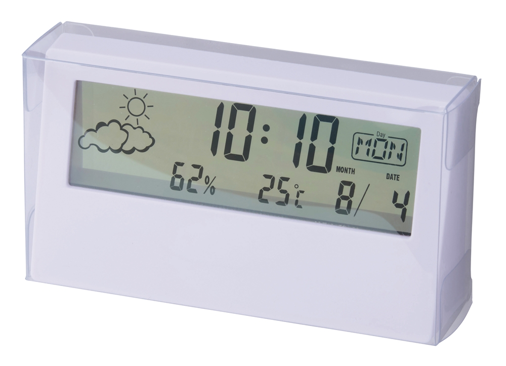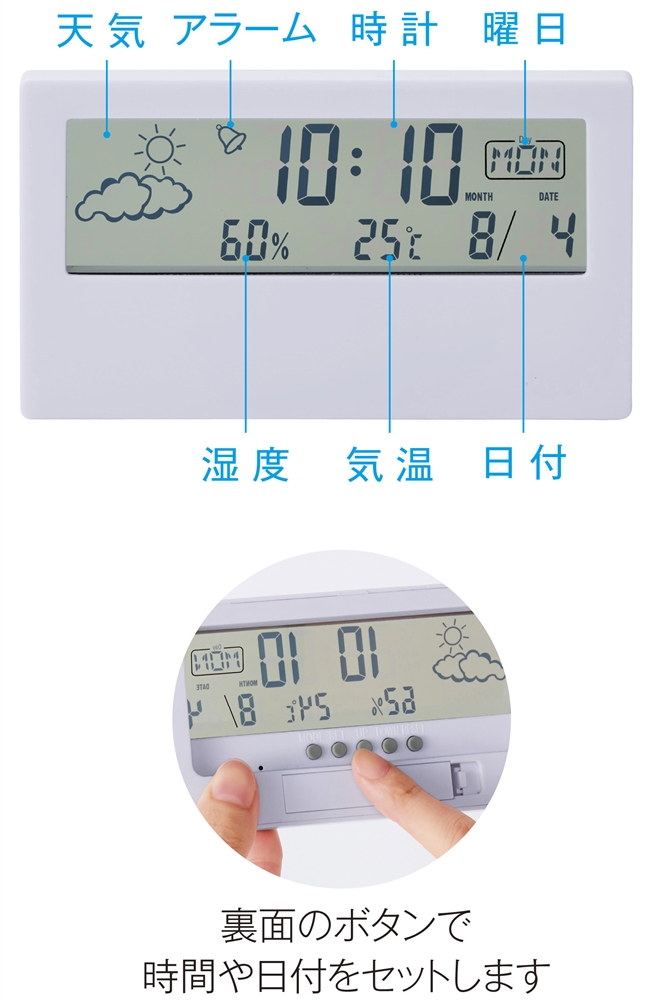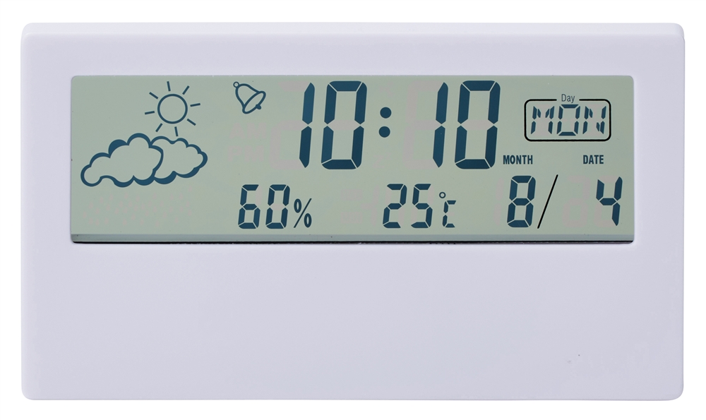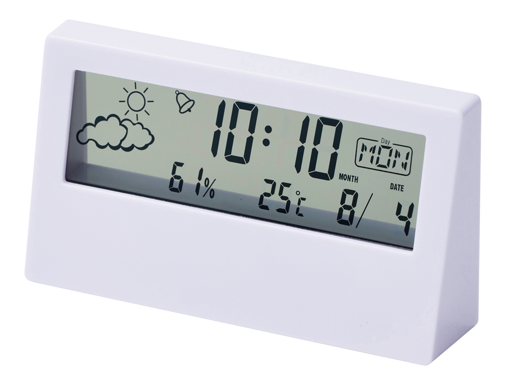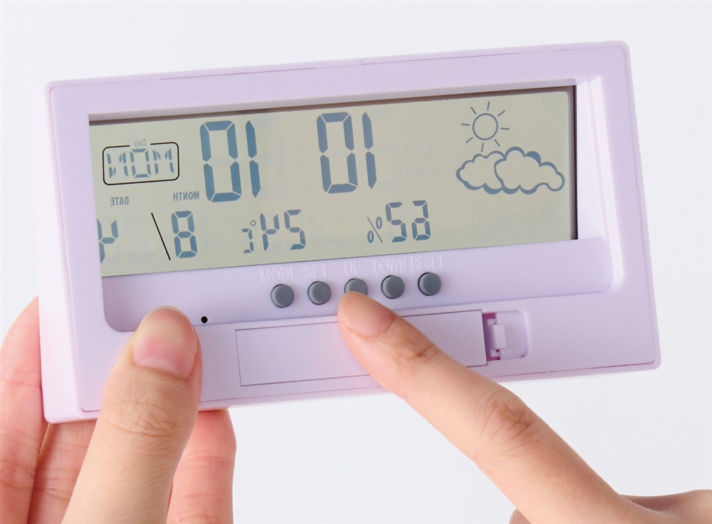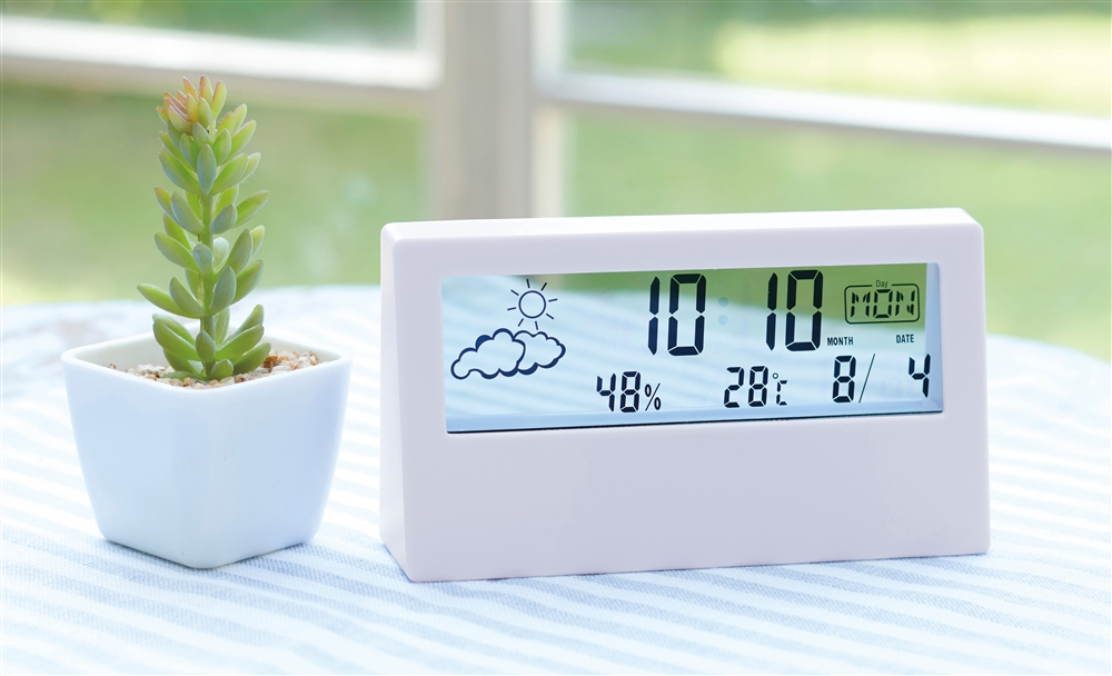 時計・日付・温湿度・天気の機能が付いた多機能なデジタル時計。