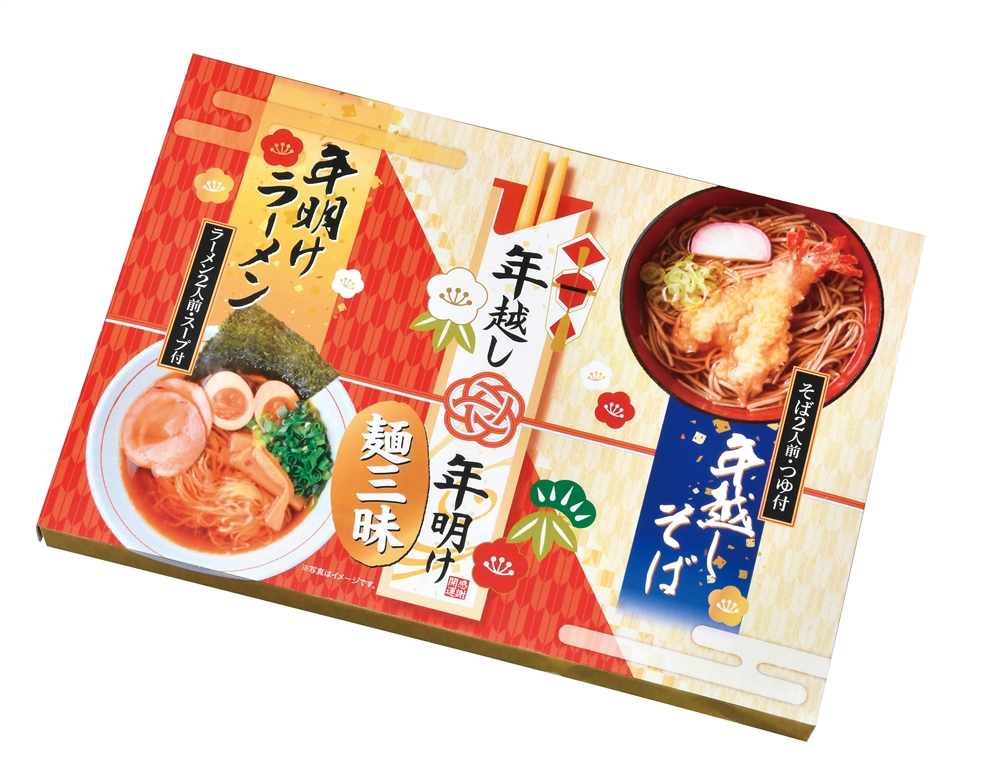 2種の麺を年末年始にお楽しみいただける「麺三昧」です。パッケージデザインはおめでたい赤と黄金の2デザインにし、華やかさをもたせました。お好みの具材をそれぞれに盛り付け、召し上がってください。ラーメンとそばを食べ比べできるセット内容も他ではなかなかない魅力の一つです。