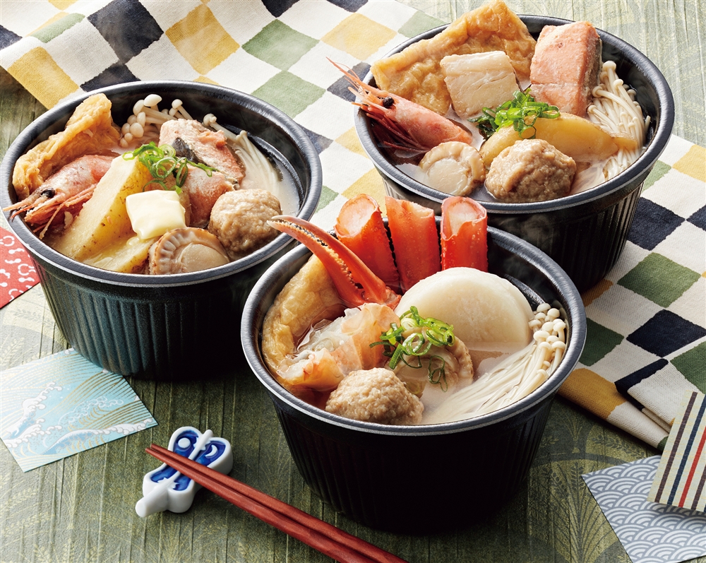 紅ずわいがにの旨味がきいた塩味と、鱈や鮭などの具材と相性の良い醤油味、バターのコクが後を引くみそ味の3種類をお届けします。