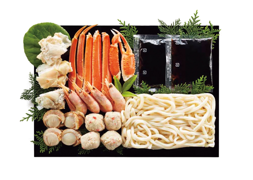 <セット内容> ボイル本ずわいがにカット200g、ボイル海老×4尾、ボイル帆立×4個、かに入つみれ×4個、冷凍うどん250g×1玉、たれ(濃縮:醤油仕立て)50ml×2袋