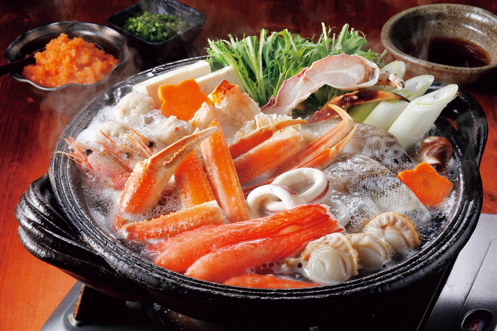 <セット内容> ゆでずわいがにカット150g、生たらばがにカット100g、生ずわいがに棒ポーション100g、ボイル海老×6、ボイル帆立×3、かに入つみれ×3、助宗鱈切身40g×3、ツボ抜きいか100g×1、だし用昆布5g×2、ポン酢たれ30g×4、紅葉おろし10g×4