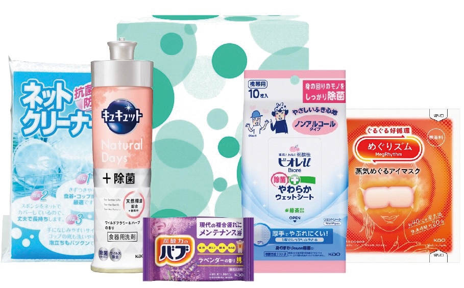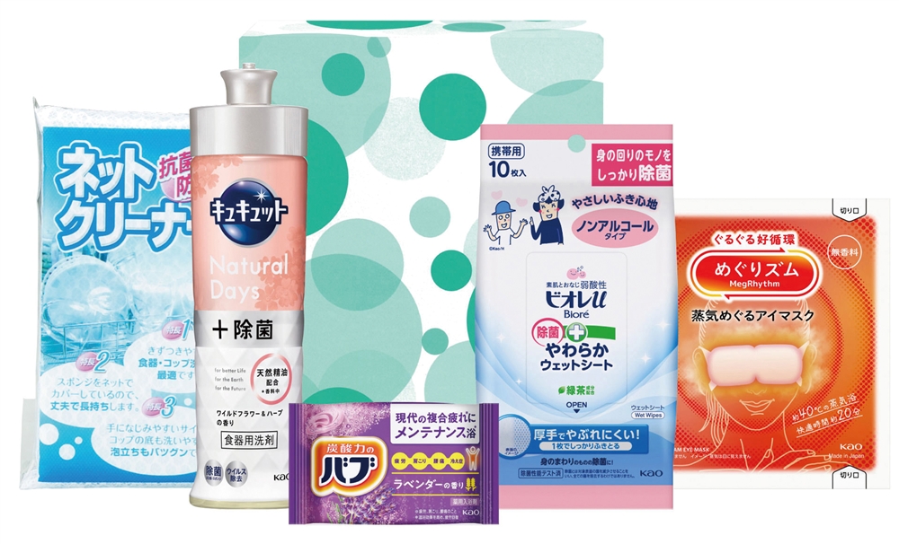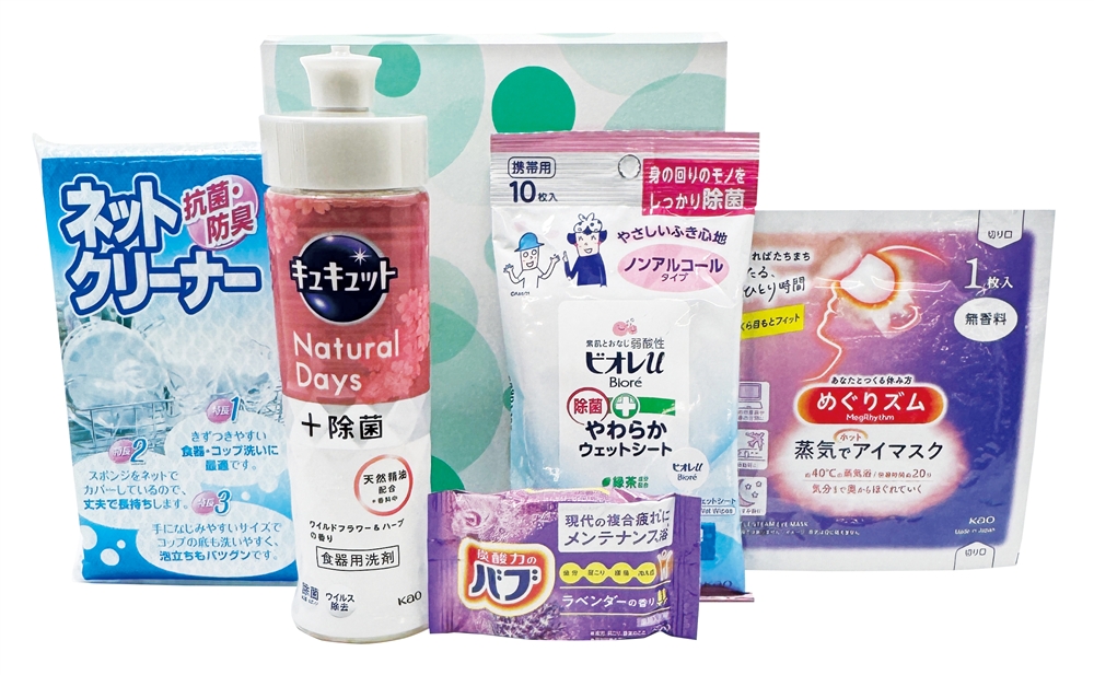 <セット内容> ・花王 キュキュット220ml(NaturalDays+除菌ワイルドフラワー&ハーブ)×1 ・花王 めぐリズム蒸気めぐるアイマスク(無香料)×1 ・花王 バブ(ラベンダーの香り)×1 ・花王 ビオレu除菌やわらかウェットシート10枚(ノンアルコール)×1 ・ネットクリーナー×1