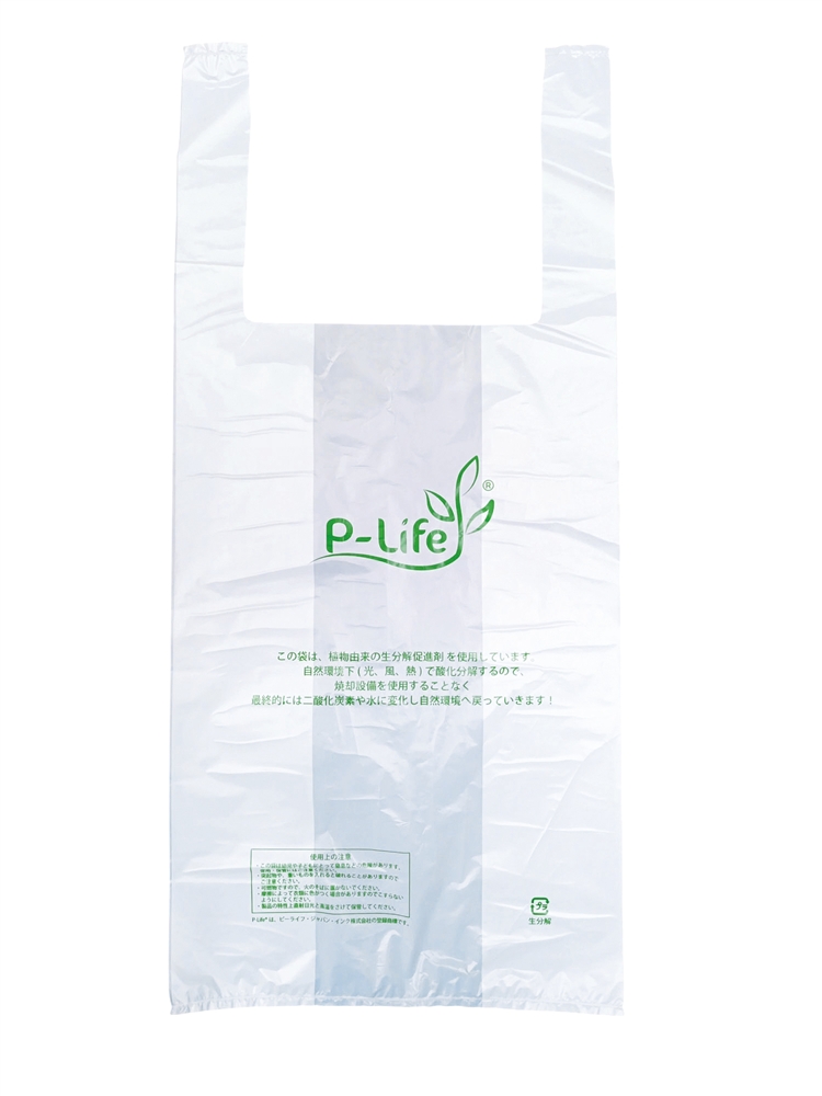 環境に配慮した自然に戻せるP-LIFE(生分解促進剤)を添加した持ち手付きポリ袋です。