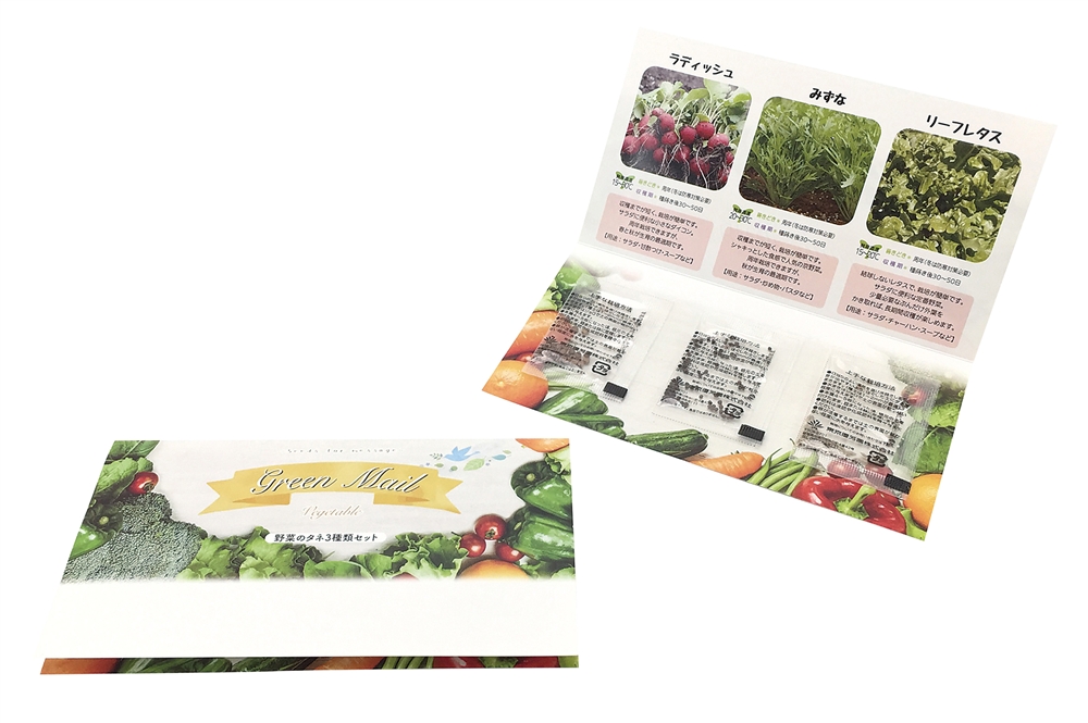 二つ折りの台紙に3種類の野菜の種子付き。 台紙にはオリジナルメッセージを入れられます。
