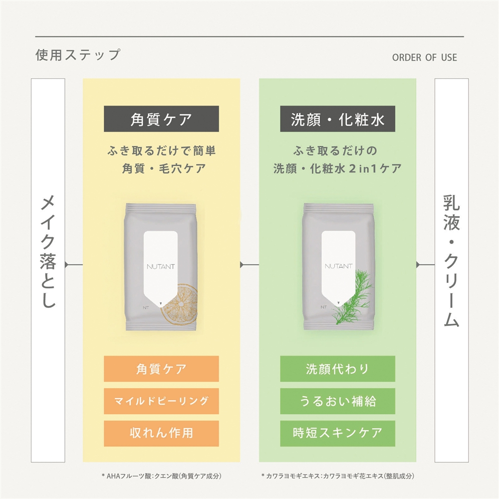 [角質ケアシート] ・肌のザラつき、くすみのもととなる古い角質や毛穴汚れをオフ ・気になる背中や腕など全身の角質ケアにもおすすめ ・肌あたり柔らかなコットン配合厚手シート採用 ・乾燥しにくく携帯にも便利な小分けパック [洗顔・化粧水シート] ・洗顔・化粧水がひとつになった時短スキンケア ・汗・皮脂、毛穴汚れをやさしくオフ ・保湿成分配合で肌にうるおいを与える ・肌あたり柔らかなコットン配合厚手シート採用 ・乾燥しにくく携帯にも便利な小分けパック