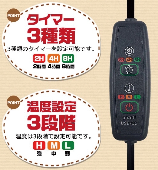 ■敷くだけであったかグッズに変身! ちょうどいい温度のUSBヒーターマット!ペットハウスやクッションに敷くだけであったかグッズに変身します! ■低消費電力で経済的! 1日(8時間)使用で約1円の低消費電力タイプ! ※電気料金1kwh=27円の場合。使用環境や電力会社・契約内容によって異なります。 ■タイマー3種類!温度設定3段階! 3種類のタイマーを設定可能です。温度は3段