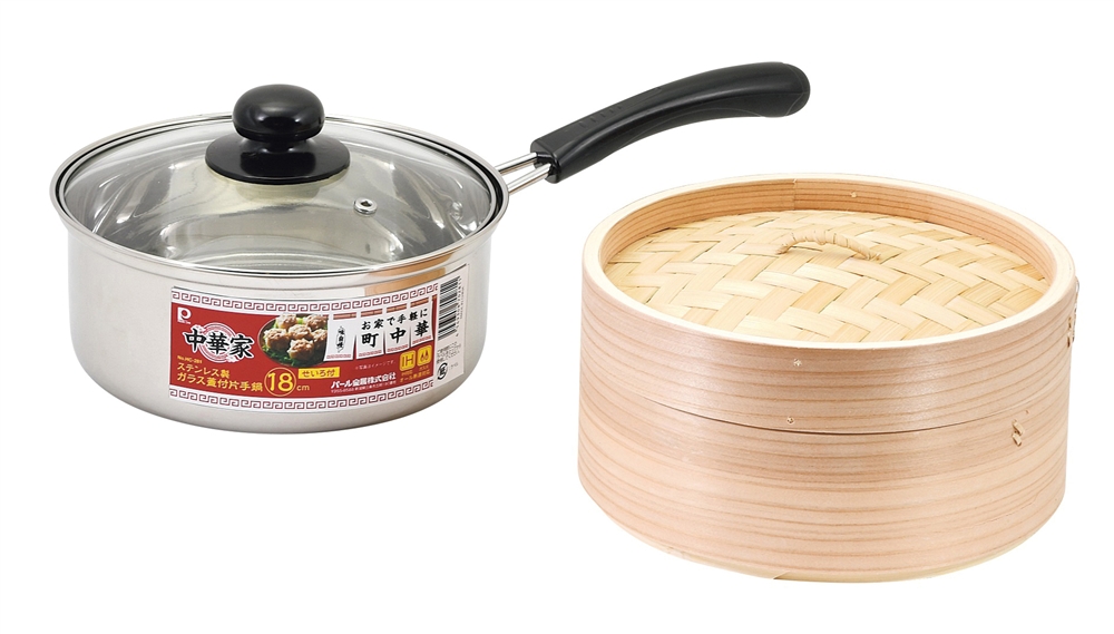 中華家 ステンレス製 ガラス蓋付片手鍋18cm(せいろ付)