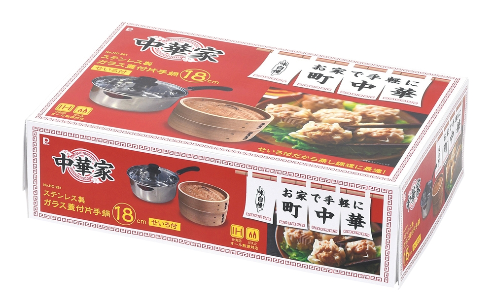 ”販促ノベルティ・記念品・イベントに!” 『中華家 ステンレス製 ガラス蓋付片手鍋18cm(せいろ付)』
