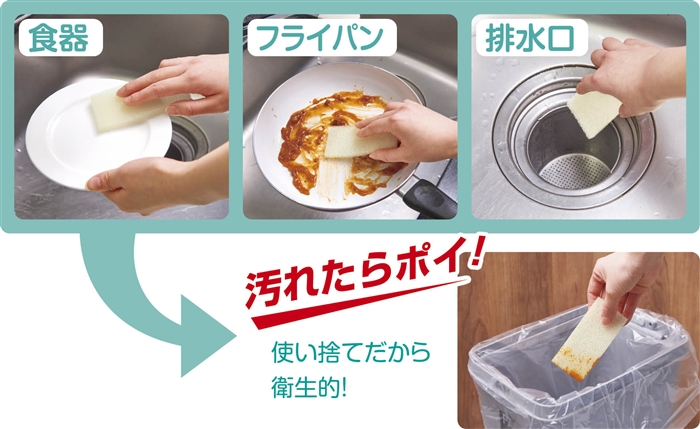 菌の発生しやすいスポンジは使い捨てが最も衛生的。程よい厚みの使いやすい使い切り型スポンジです。30枚も入っているのでコスパ抜群!食器を洗って1日の終わりにはガス台やシンク・排水口などもお掃除!次の日には新しいスポンジで気持ちよくスタートできます。忙しい毎日の家事を少しでもラクに乗り切りましょう!