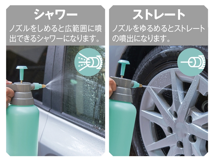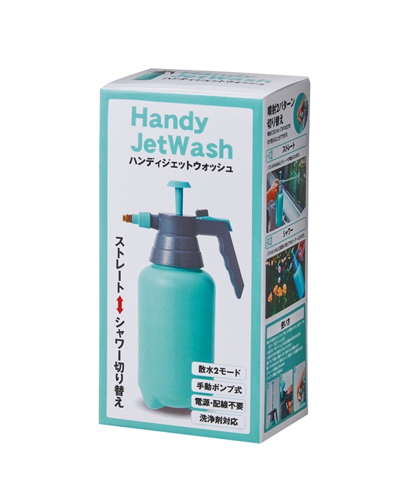 ハンディジェットウォッシュは、水や洗浄液を入れて加圧ポンプを10~15回プッシュするだけで水を噴射できます。持ち運びやすく、電源不要でどこでも使用可能。ノズルを調整して、広範囲に噴射できるシャワータイプと、ストレートタイプに切り替えができます。園芸の水やり、窓やタイヤの掃除など多目的に使用できます。