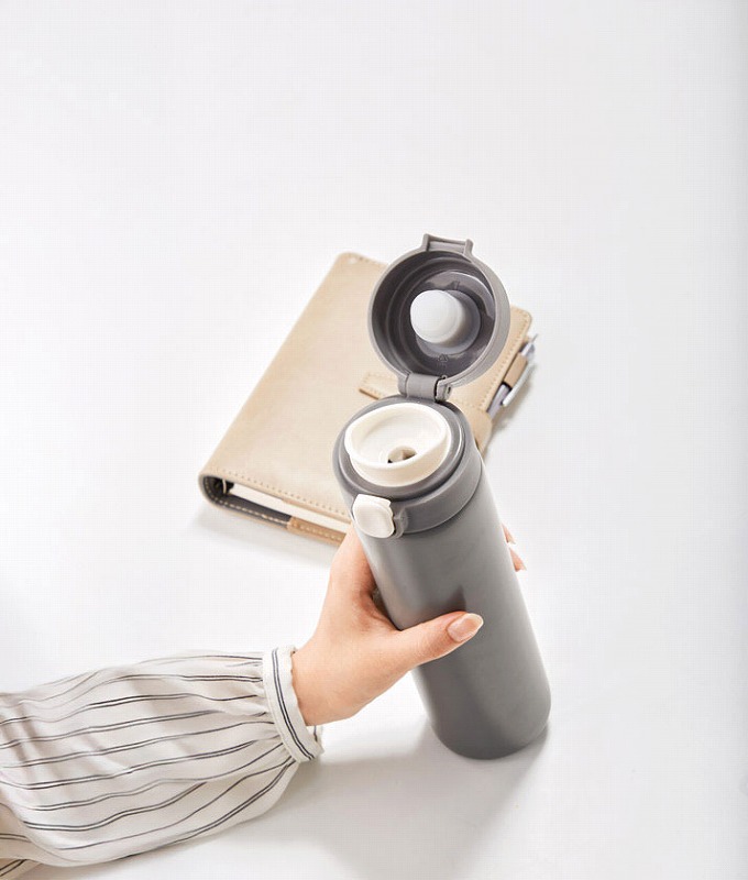 プッシュボタンにロックとオープン機能が付いた、 直飲みタイプの保冷温ステンレスボトルです。 底面には滑り止めが付いています。