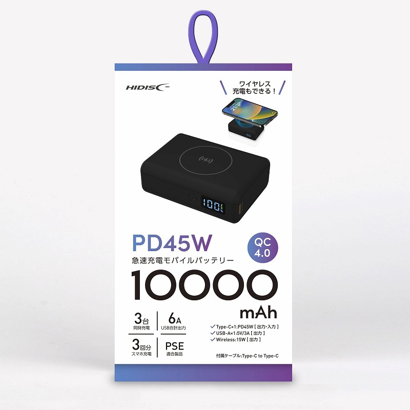 バッテリー容量:10000mAh 入力:Type -C : 5?A/9?A/12?A/15?A/20?.25A (45W max) 出力:Type -C: 5?A/9?A/12?A/15?A/20?.25A (45W max) USB A: 5?A/9?A/12?A (36W max) Wireless: 5?A/9?.1A/9?.67A (15W max) C+A+W: 15W+15W+15W PPS PD3.0 QC3.0 QC4.0 SCF FCP AFC PE2.0 充電時間:約1時間