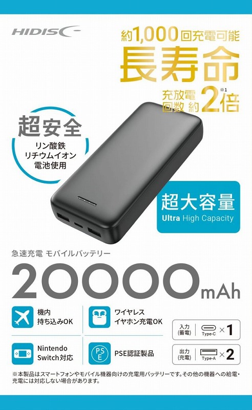 バッテリー容量:20000mAh 入力:Type-C:5V?2.0A 出力:Type-A:5V?2.0A Type-A:5V?2.0 充電時間:約12時間