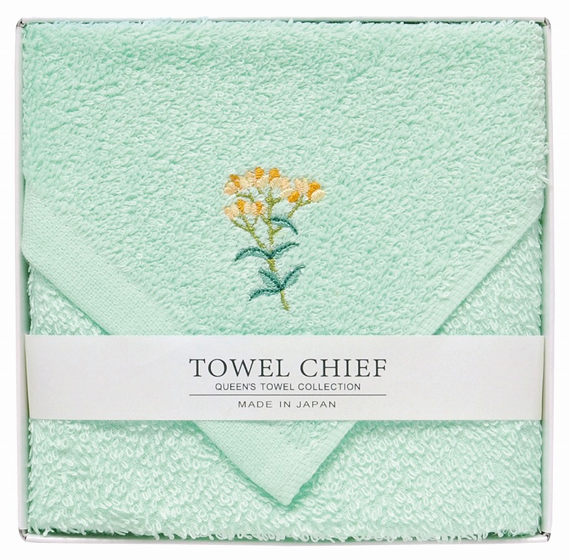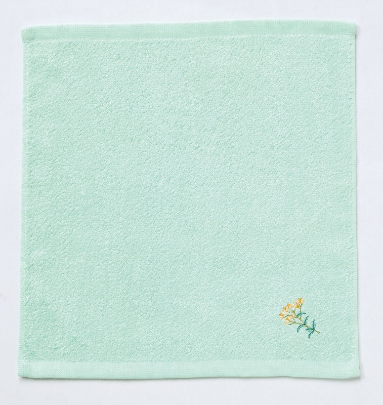 国産の大判タオルハンカチのそれぞれの色の生地に合った草原の花をワンポイントで刺しゅうしたかわいいタオルハンカチに仕上がりました。