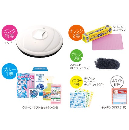 特等:モッピー×1コ/1等:クリーンギフトセットNXG-B×2コ/2等:シリコンエコラップ×3コ/3等:ふわふわおそうじモップ×4コ/4等:デザインペーパーナプキン(10P)×5コ/5等:キッチンクロス(1P)×35コ/抽選球×50コ