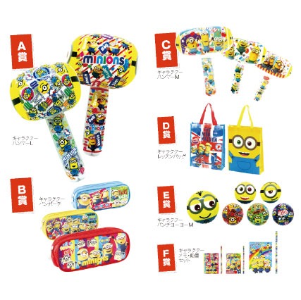 A賞:キャラクターハンマーL×1コ/B賞:キャラクターペンポーチ×2コ/C賞:キャラクターハンマーM×3コ/D賞:キャラクターレッスンバッグ×4コ/E賞:キャラクターパンチヨーヨーM×5コ/F賞:キャラクターメモ・鉛筆セット×35コ