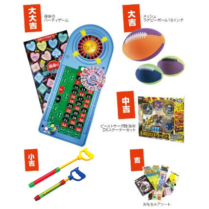 大大吉:運命のパーティゲーム×1コ/大吉:メッシュラグビーボール16インチ×2コ/中吉:ビーストサーガ陸海空DXスターターセット×3コ/小吉:ウォータースプラッシュスティック×4コ/吉:おもちゃアソート×40コ