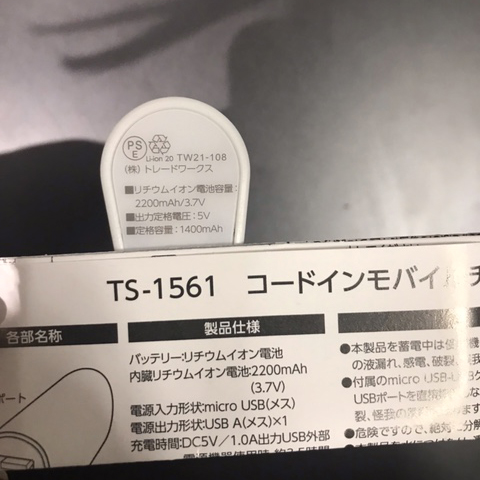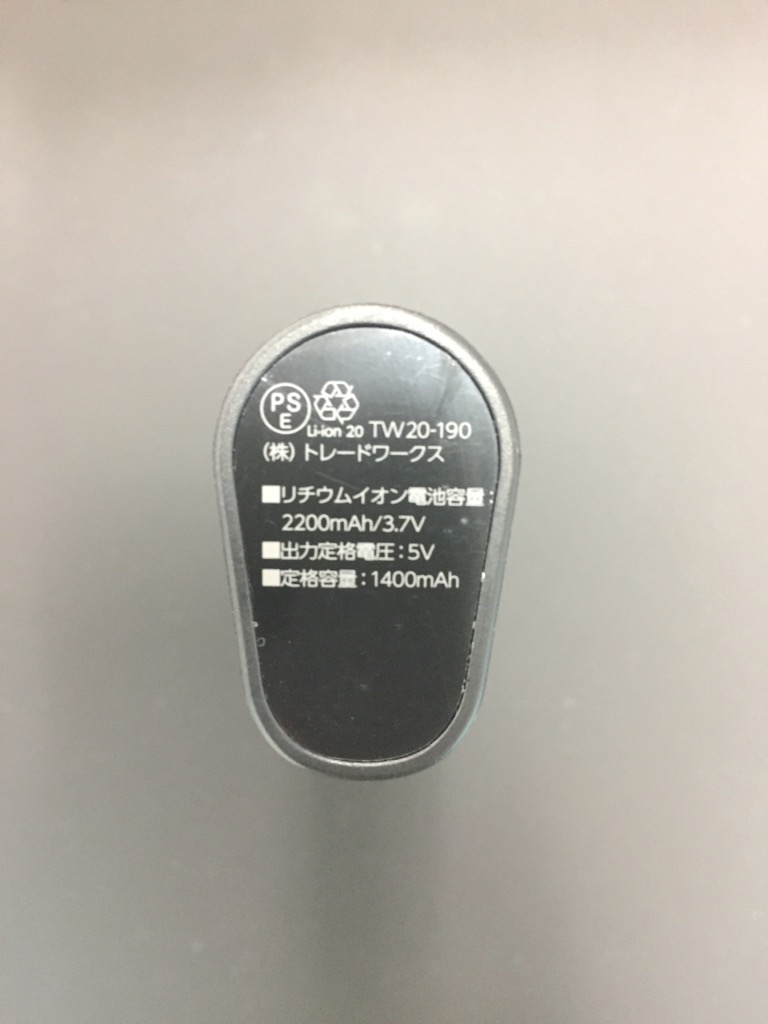 取説付、最大出力1A、バッテリー容量2200mAh、本体重量約82g、micro USBケーブル内蔵、スマートフォン約1回充電可能