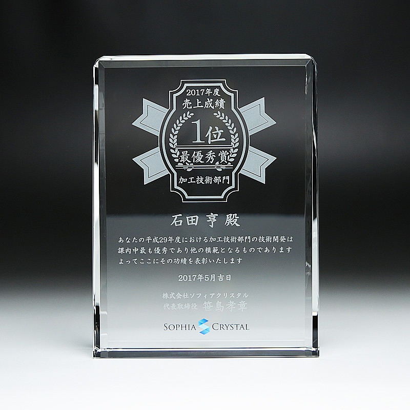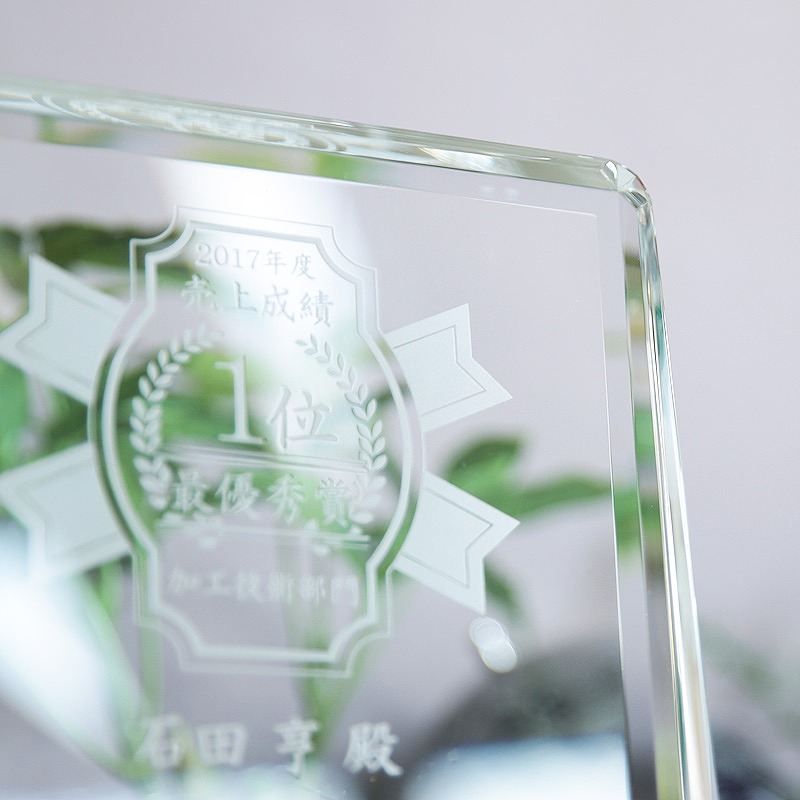 クリスタル製の盾をまとめたカテゴリ。各種記念品や表彰などの記念品向けにレーザー刻印やサンドブラスト加工に対応しています。