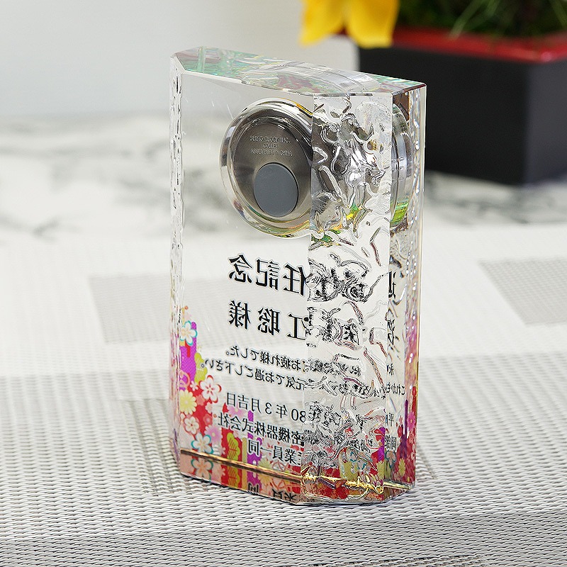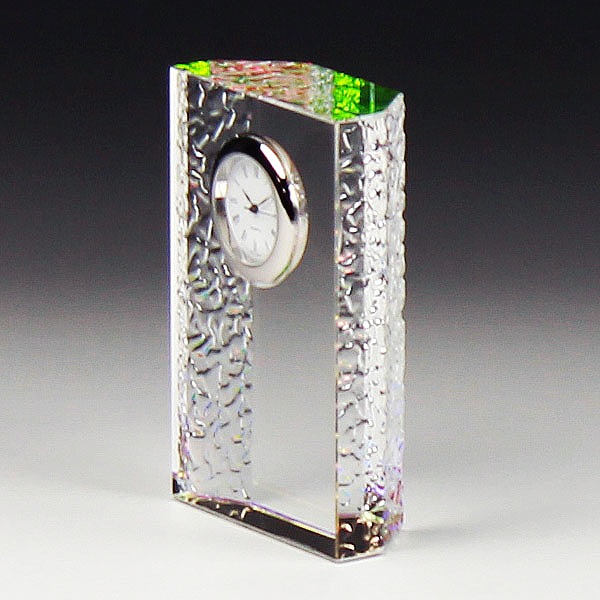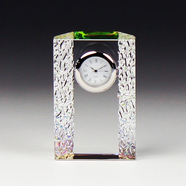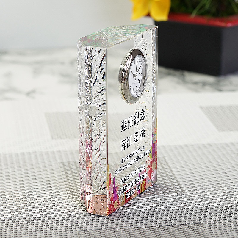 クリスタル製の時計付き盾をまとめたカテゴリ。各種記念品や表彰などの記念品向けにレーザー刻印やサンドブラスト加工に対応しています。