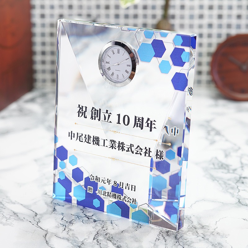 クリスタル製の時計付き盾をまとめたカテゴリ。各種記念品や表彰などの記念品向けにレーザー刻印やサンドブラスト加工に対応しています。