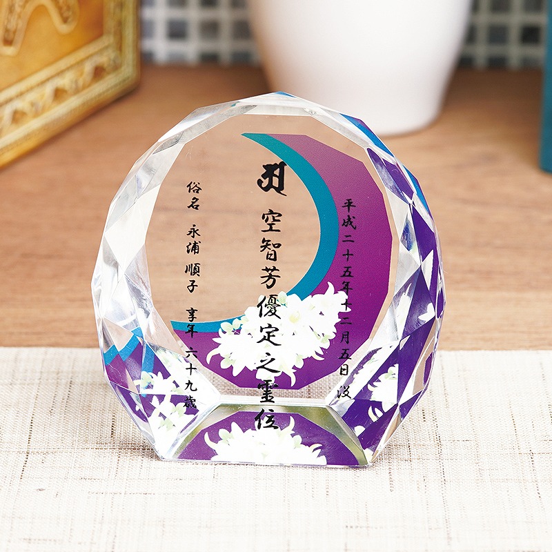 クリスタル製の位牌や仏器・仏具をまとめたカテゴリ。サンドブラスト加工にも対応しています。
