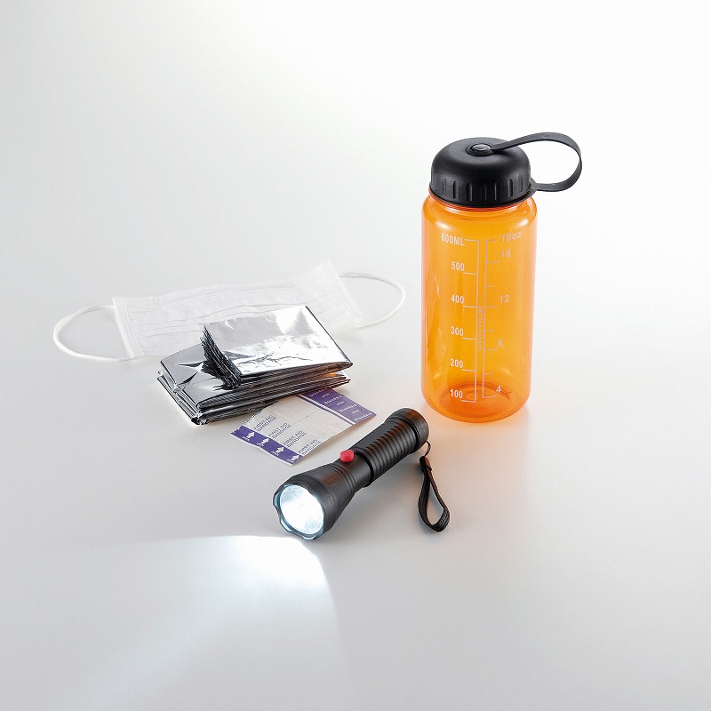 携帯しやすいウォーターボトルに、非常時に重宝するアイテムをセットしました。各ご家庭で必要な品を追加封入して常備することもできます。 ■セット内容:ウォーターボトル(満水容量690ml)、懐中電灯、防寒用アルミシート、マスク、救急絆創膏2枚■電池:単4電池×3本使用(別売)/懐中電灯※日本国内でセット加工しています。