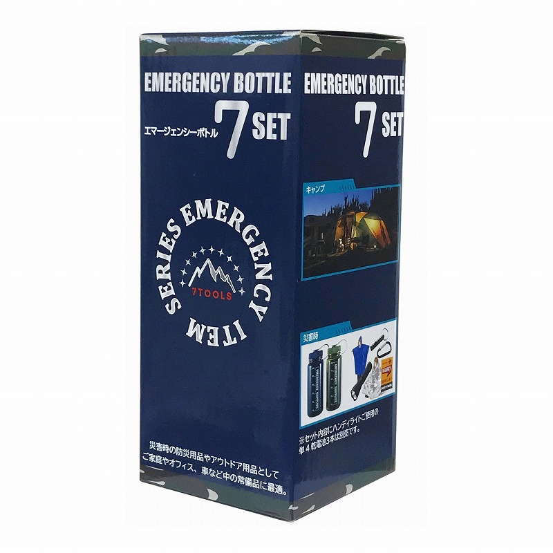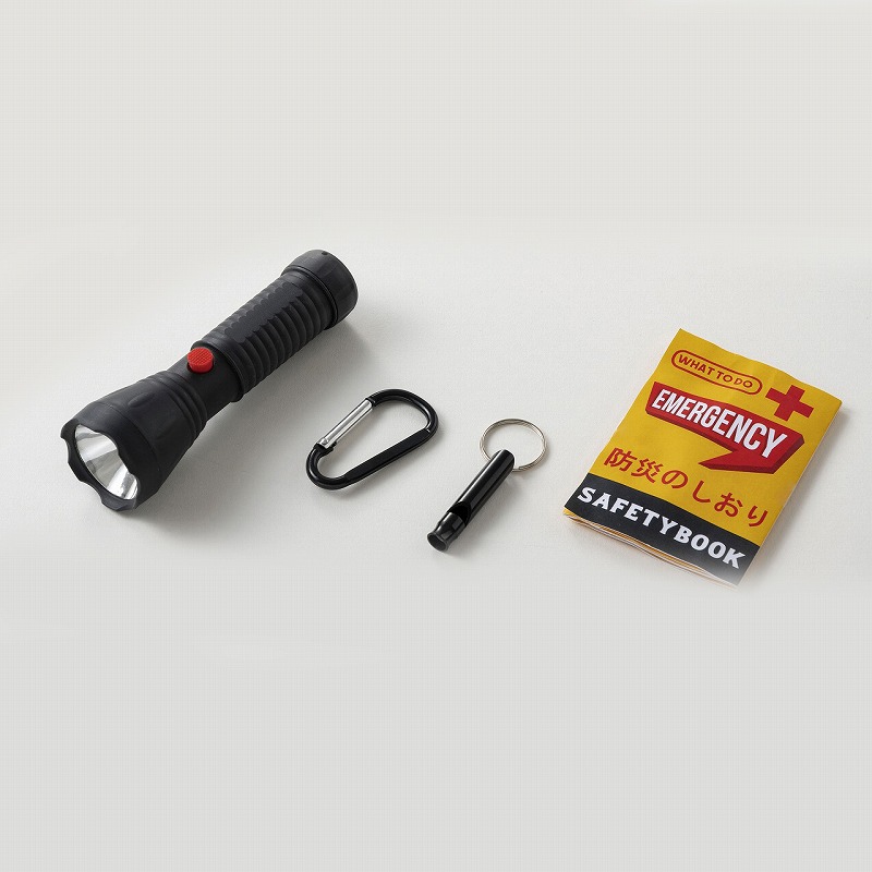 ・ボトル:AS樹脂・ポリプロピレン・シリコン・ポリエチレン ・ライト:ポリプロピレン・TPR ・ホイッスル:アルミニウム ・アルミブランケット:アルミ蒸着PET ・レインポンチョ:ポリエチレン ・カラビナ:アルミニウム ・防災しおり:紙