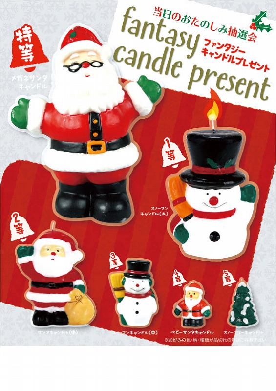 特等:メガネサンタキャンドル×1コ/1等:スノーマンキャンドル(大)×2コ/2等:サンタキャンドル(中)×3コ/3等:スノーマンキャンドル(中)×4コ/4等:ベビーサンタキャンドル×5コ/5等:スノーツリーキャンドル×15コ/A3ポスター/抽選箱/くじ30枚/店頭用お知らせPOP2枚