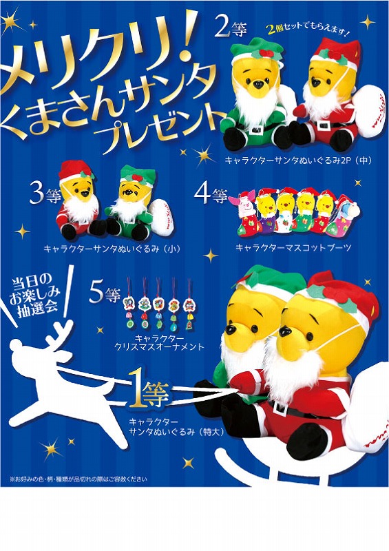 1等:キャラクターサンタぬいぐるみ(特大)×1コ/2等:キャラクターサンタぬいぐるみ2P(中)×2コ/3等:キャラクターサンタぬいぐるみ(小)×3コ/4等:キャラクターマスコットブーツ×4コ/5等:キャラクタークリスマスオーナメント×90コ/A3ポスター/抽選箱/くじ100枚/店頭用お知らせPOP2枚